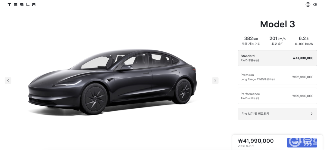 据了解,廉价版Model 3在配置上进行明显精简,官方称为“Model 3 Standard RWD”(标准后驱版),以韩国官网显示的车型为例,Model 3 Standard RWD续航里程为382公里,相比原有入门版的583公里续航减少了201公里,百公里加速时间从5.2秒延长至6.2秒。