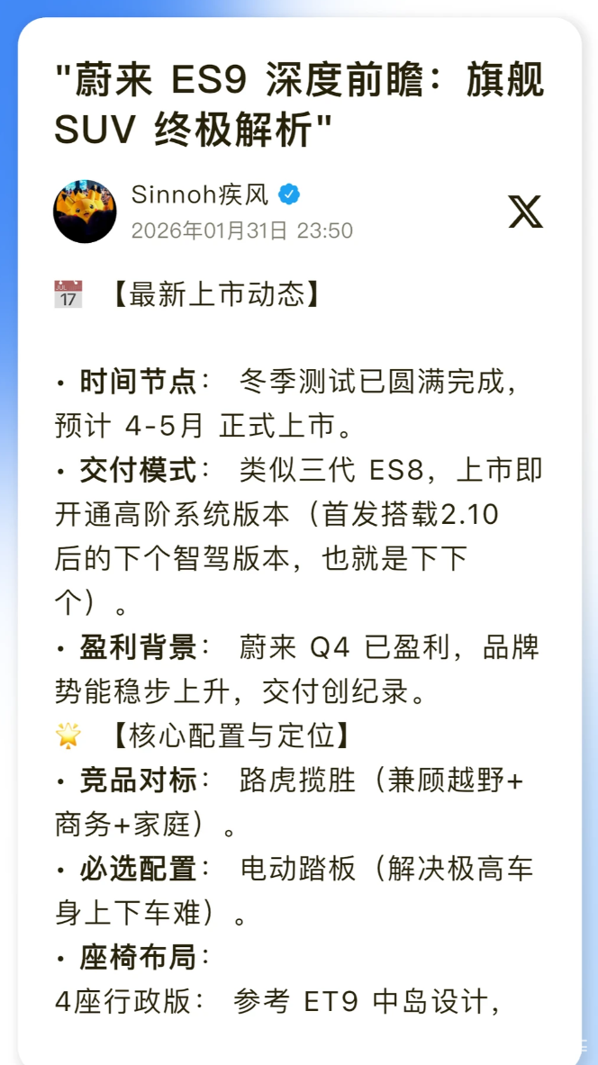 上市节奏上,ES9冬季测试已圆满完成,上市即开通高阶智驾系统(首发2.10后的下一个智驾版本),无需用户额外等待功能解锁。结合蔚来Q4已盈利、交付创纪录的品牌势能,这款旗舰SUV被业内看好成为60万+预算的“首选车型”。官方还给出清晰购车建议:60万+预算可直接冲ES9,性价比爆棚;50万左右需评估现金流,毕竟ES9定位更高端;30-40万级则适合选择ES8,门槛更友好,精准覆盖不同预算用户。