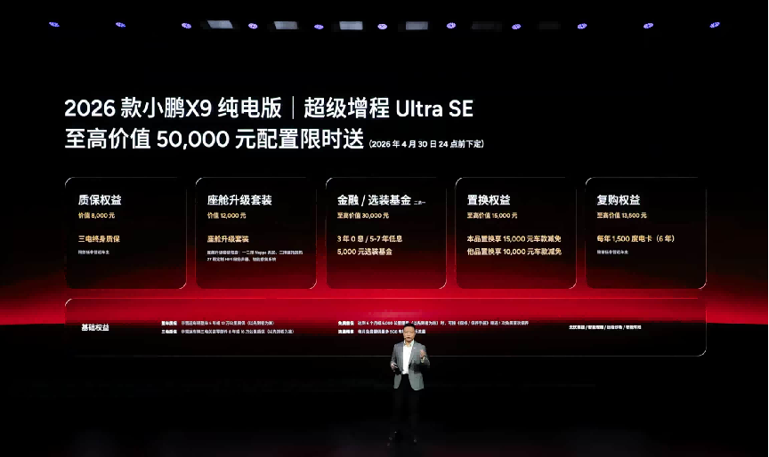 即日起至2026年4月30日24点(含) 前下定2026款小鹏X9纯电版,可享最高价值50,000元的限时购车权益,具体包括: