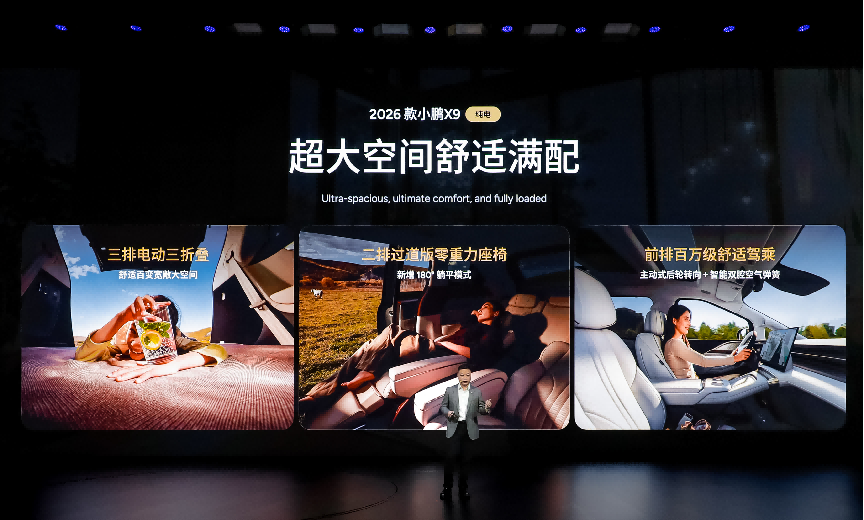 作为一款家用大七座MPV,空间灵活性是2026款小鹏X9的亮点。新车全系标配三排电动三折叠座椅,可灵活实现4/5/6/7座多种模式,最大储物空间可扩展至2514L。中央过道宽180mm,方便进出第三排。