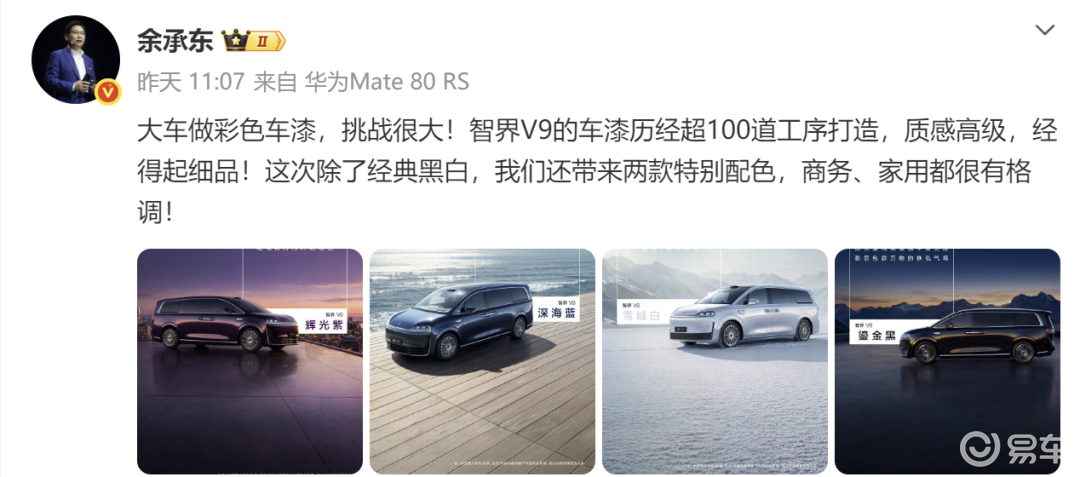 智界V9四款颜色,余承东亲自揭晓,排面拉满;